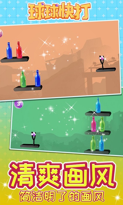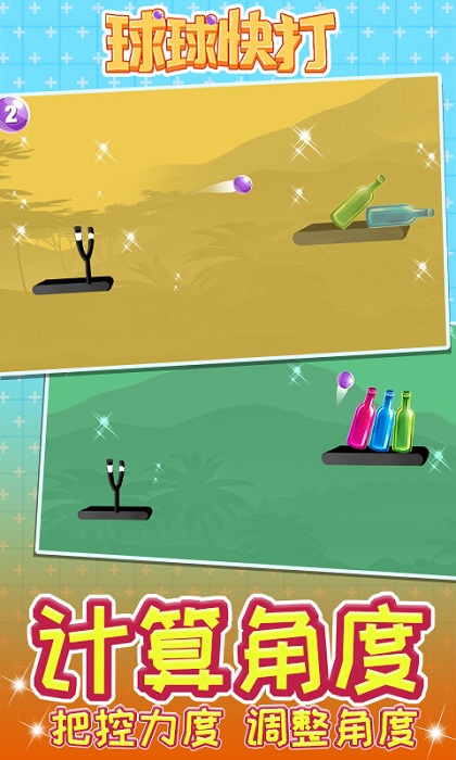 1、物理弹射机制:依托物理弹射原理设计玩法,小球飞行轨迹遵循力学规律,高台上的彩色瓶子等目标摆放巧妙,需借弹射之力精准命中,充满策略性。