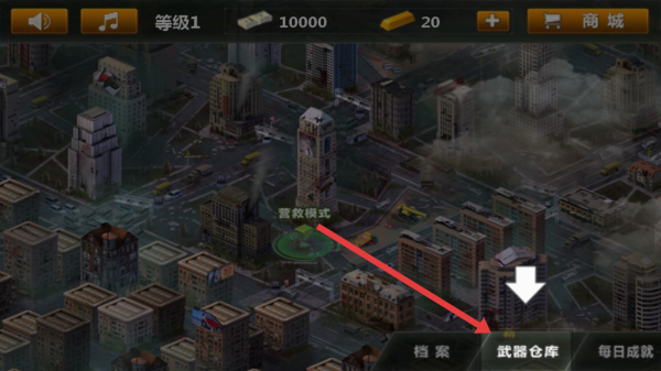 1、在游戏主界面点击武器仓库选项,进入武器管理界面,为应对僵尸储备武器资源。