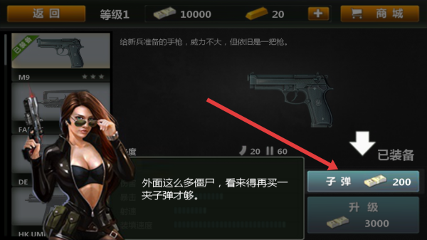 2、在武器仓库中点击子弹按钮,花费200金币为武器补充200发子弹,提升持续战斗能力。