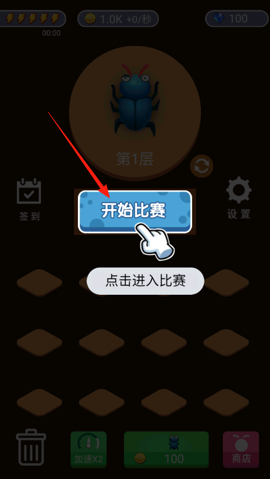 1、在游戏主界面,看到开始比赛按钮,点它就能进入比赛模式,进入后操控蓝色甲虫,和其他昆虫对手在赛道上比拼,争取跑赢拿奖励。