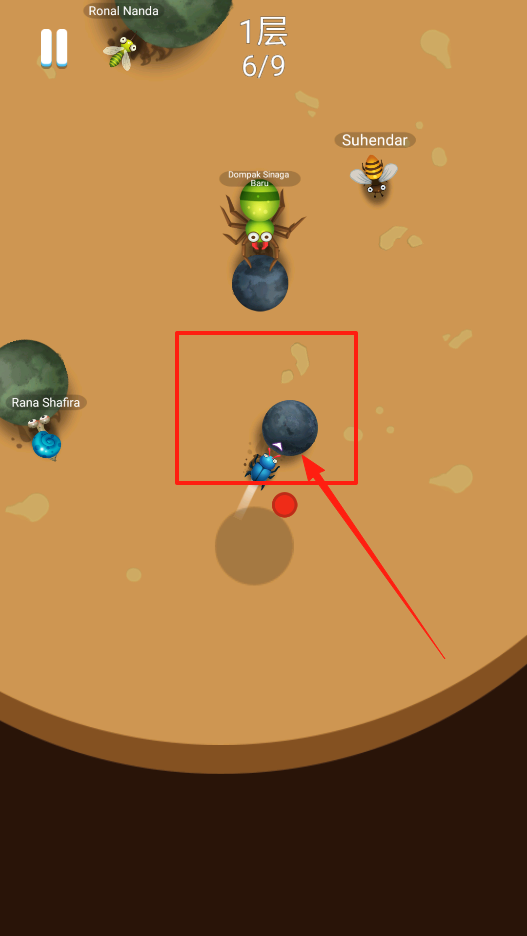 3、比赛过程中,遇到黑色圆球操控甲虫去推动它,推动圆球时要躲开其他昆虫干扰,还能利用圆球挡住对手,让自己在赛道上更顺利,争取第一个冲过终点。