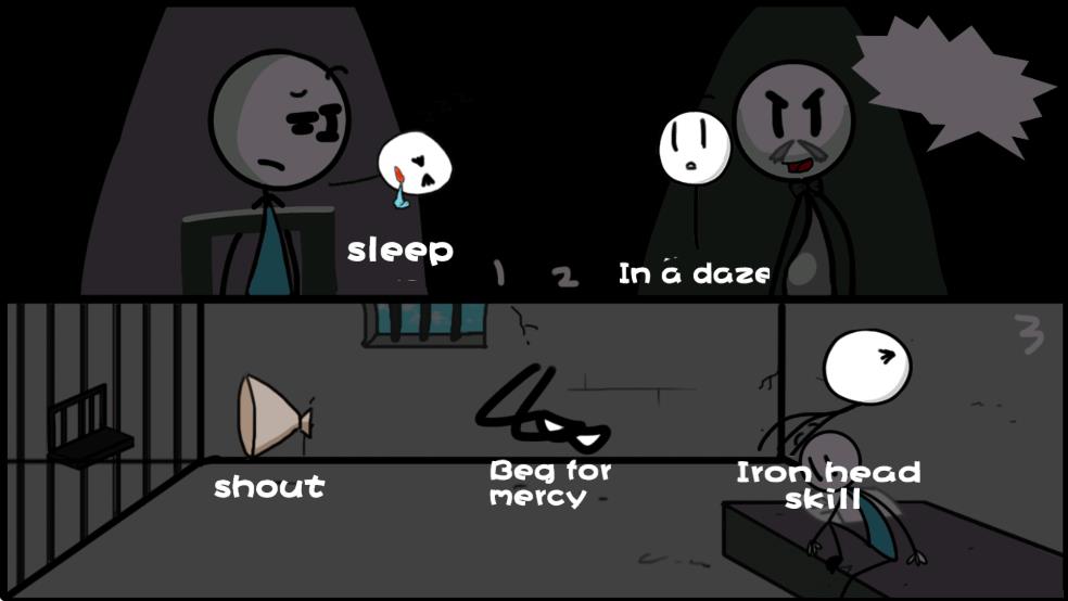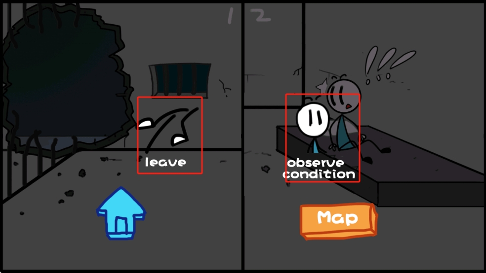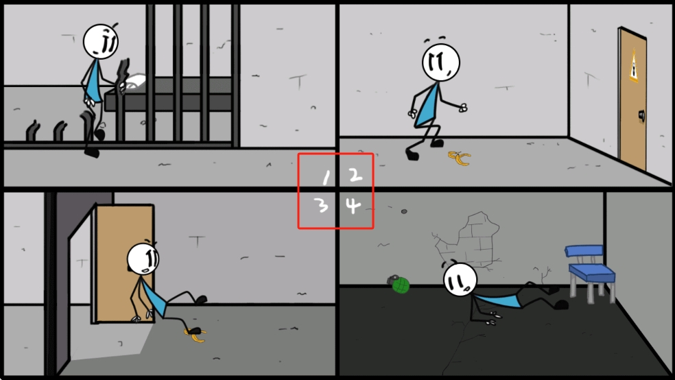 2、遵循1至4的顺序触发事件,依次完成道具拿取、移动前进、开门探索与陷阱躲避,依托场景逻辑推进火柴人逃生流程.
