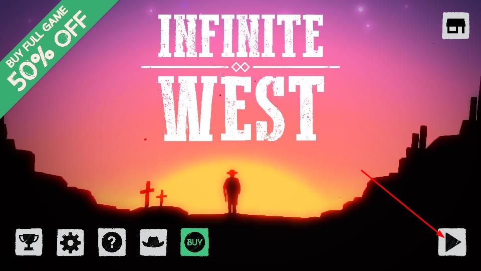 1、点击右侧黑色播放按钮开启游戏,界面左侧分布奖杯、设置、帮助、角色、购买图标,左上角BUY FULL GAME 50% OFF的折扣信息可按需关注。