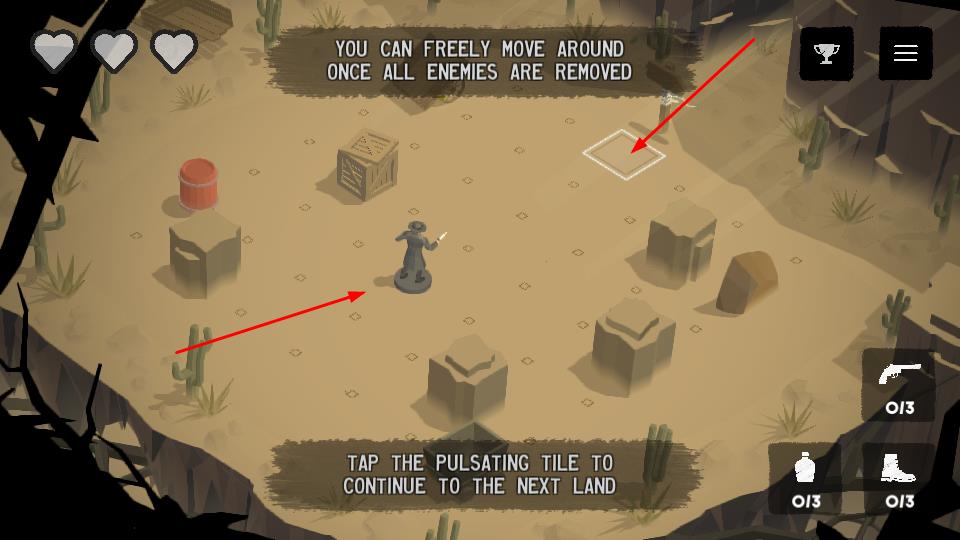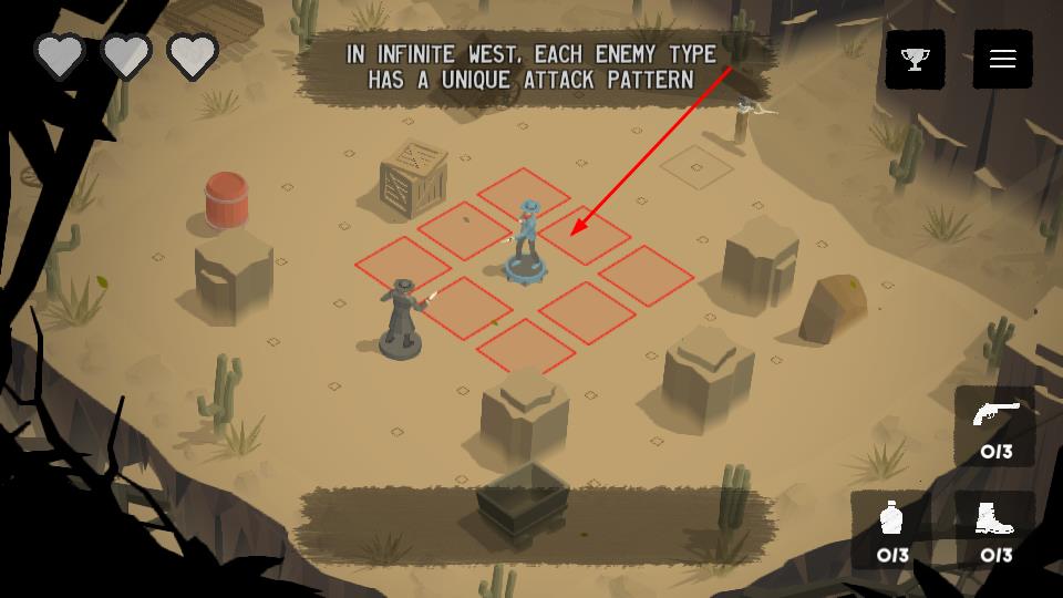 2、进入西部荒漠场景,在红色方格划定的战斗区域内,应对敌方攻势,右侧栏显示手枪、道具等装备持有数当前均为0/3,筹备战斗策略。