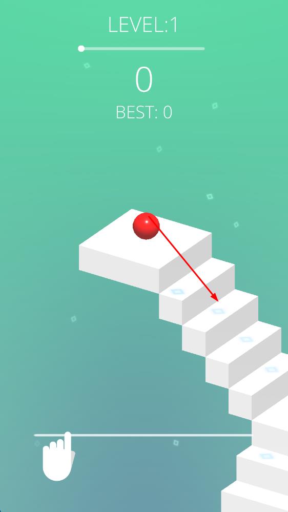 1、进入游戏,面对初始楼梯布局,控制弹力球从顶端开始下落,调整方向避开首个陷阱,让小球沿安全路线迈出下楼梯的第一步。