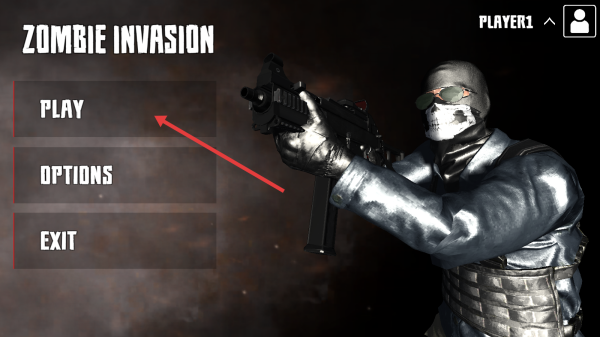 1、点击PLAY进入游戏,操控持枪角色在荒野场景迎战僵尸,优先瞄准远处僵尸,避免被围。