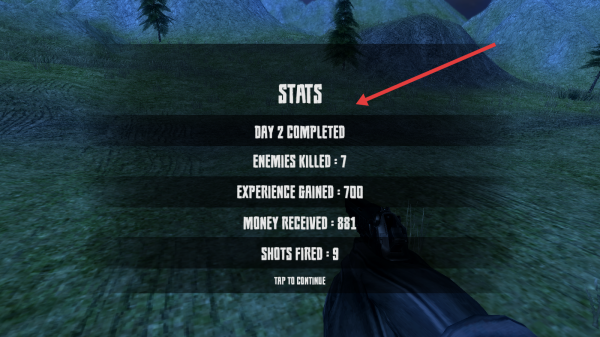 3、存活至DAY2结束,看结算杀敌数、经验等,领金钱、经验升级武器/角色,继续挑战后续天数,应对更强僵尸潮。