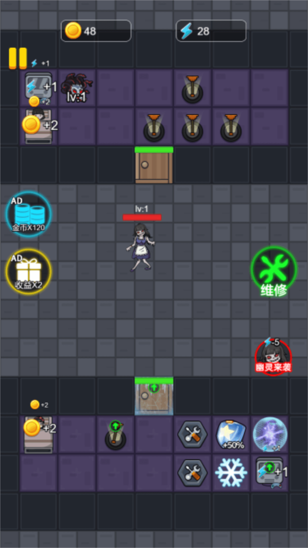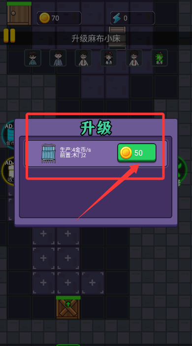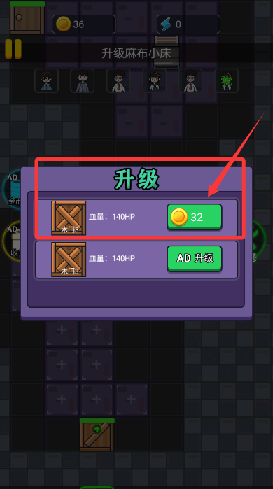 3、在对战过程中,出现升级提示时,需及时消耗金币强化木门的属性。