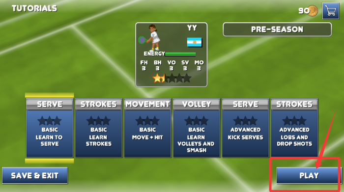 3、完成基础教学后,点击比赛按钮正式进入网球竞技场景中。