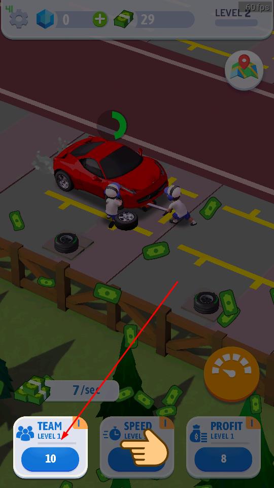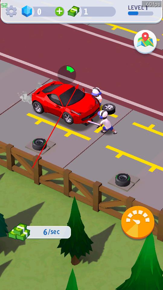 1、进入游戏界面后,指派工人为红色汽车更换轮胎,操作时留意下方6/sec类收益速率标识,持续积累金币,为后续发展储备资源。