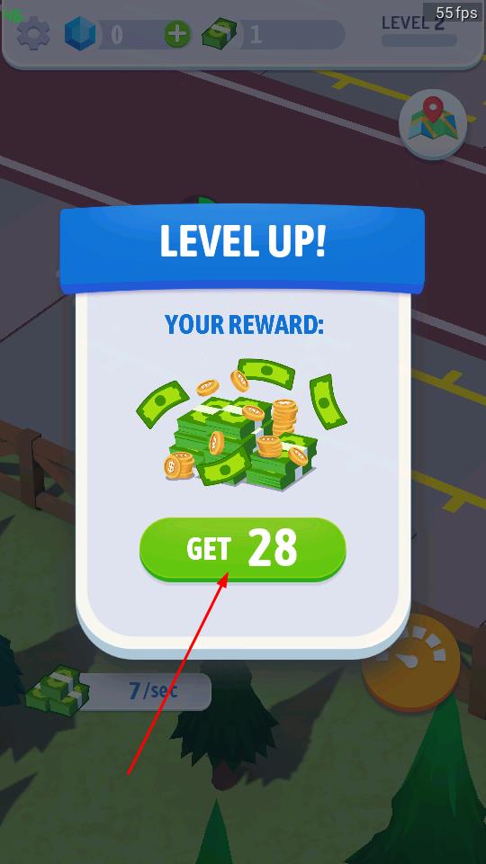 2、达成升级条件后,屏幕弹出LEVEL UP!提示框,点击绿色GET 28按钮,领取大量金币奖励,该奖励可用于设施升级或工人雇佣。