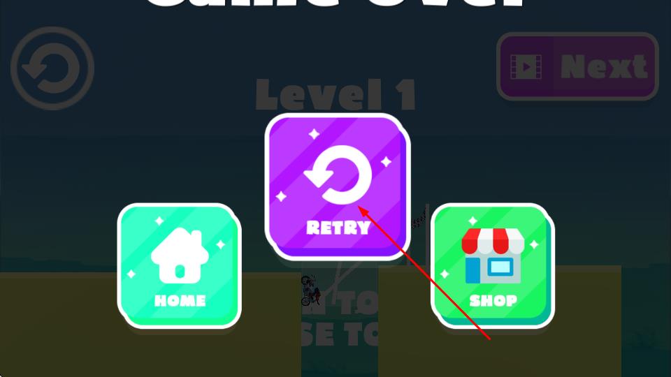 3、若挑战失败,点击紫色RETRY按钮重新开始,也可选择HOME返回主页或SHOP进入商店。