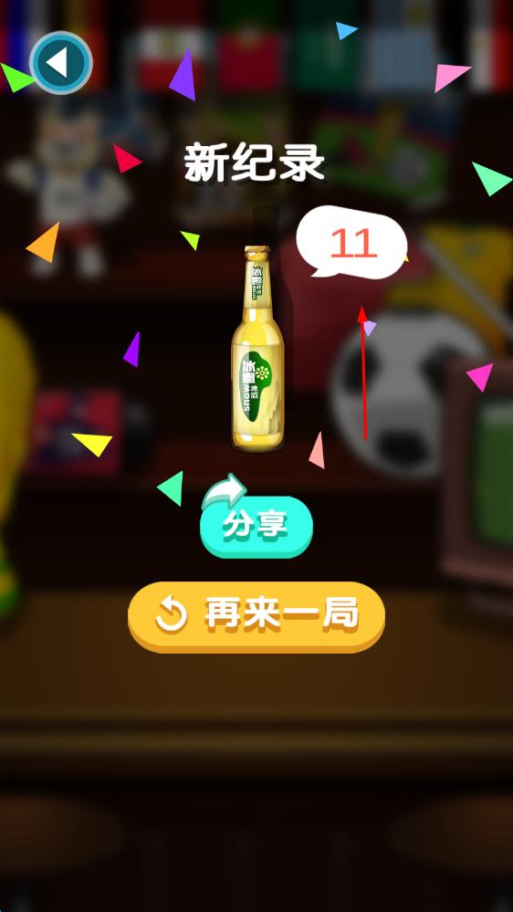 3、若连续三次未能抓住啤酒瓶,游戏便会结束,可与好友比拼抓住酒瓶的数量,看看谁能成为真正的“啤酒王”。