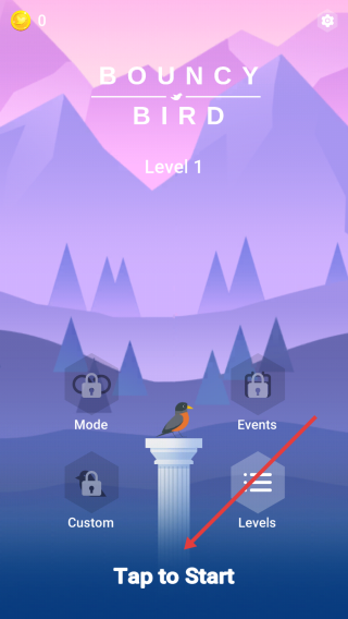 1、点击Tap to Start,进入Level1,操控小鸟在山间石柱场景跳跃,目标抵达终点柱。