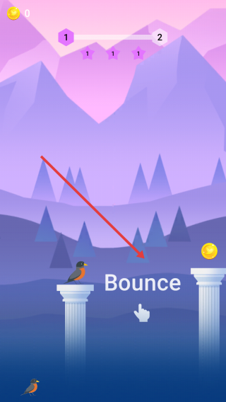 2、遇石柱间隔,点击屏幕让小鸟弹跳,把握时机落在Bounce提示区域,借弹力跳向下一根石柱,避开坠落风险。