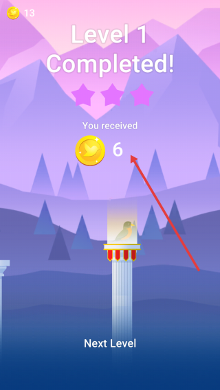 3、成功通关Level1,领取6金币奖励,点击Next Level进入下一关;用金币可解锁模式、定制小鸟,挑战更难石柱跳跃。
