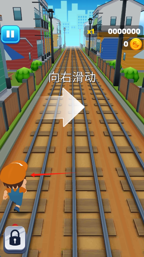 2、按向右滑动提示,操作角色移动,避开障碍,在轨道上持续前进获取高分,滑动移动人物。