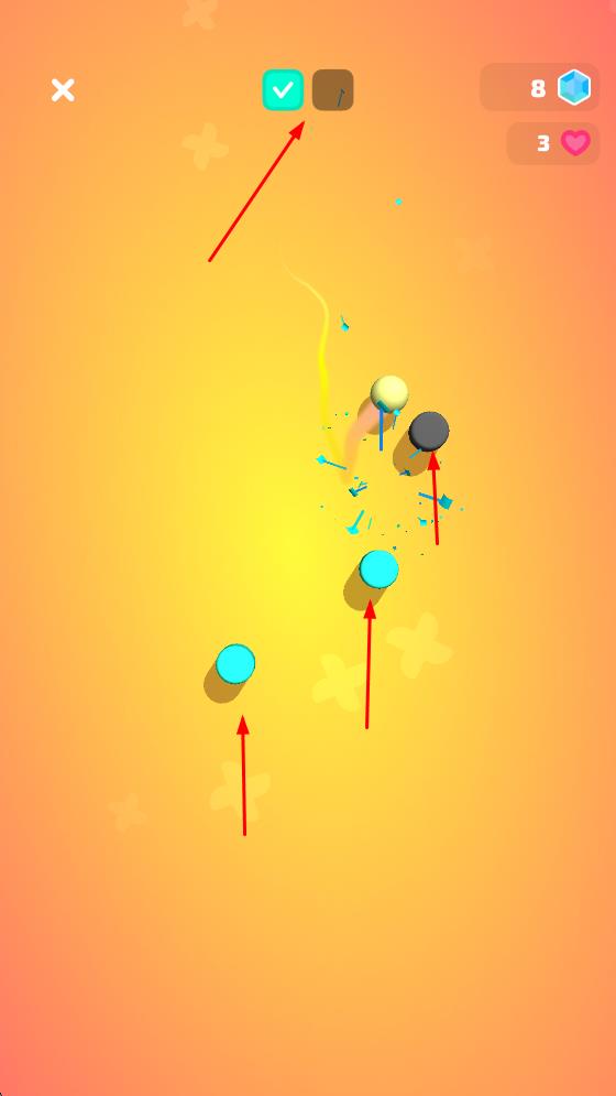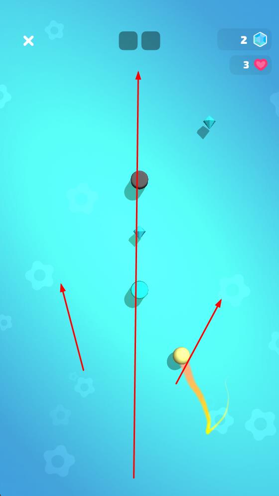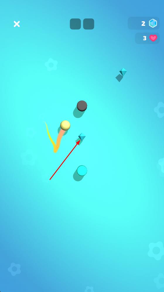 1、操控黄色小球移动射击,收集蓝色菱形道具,留意心形血量和蓝色水晶数量。