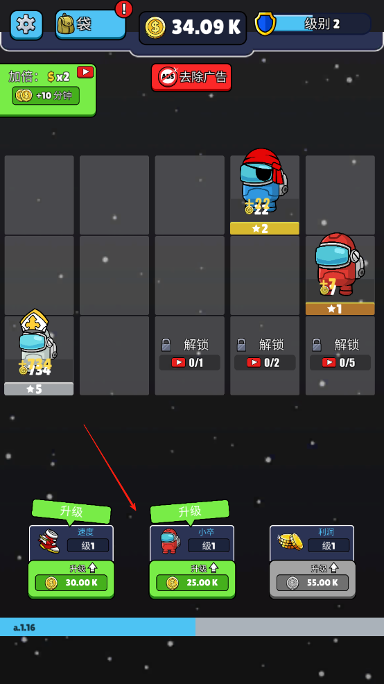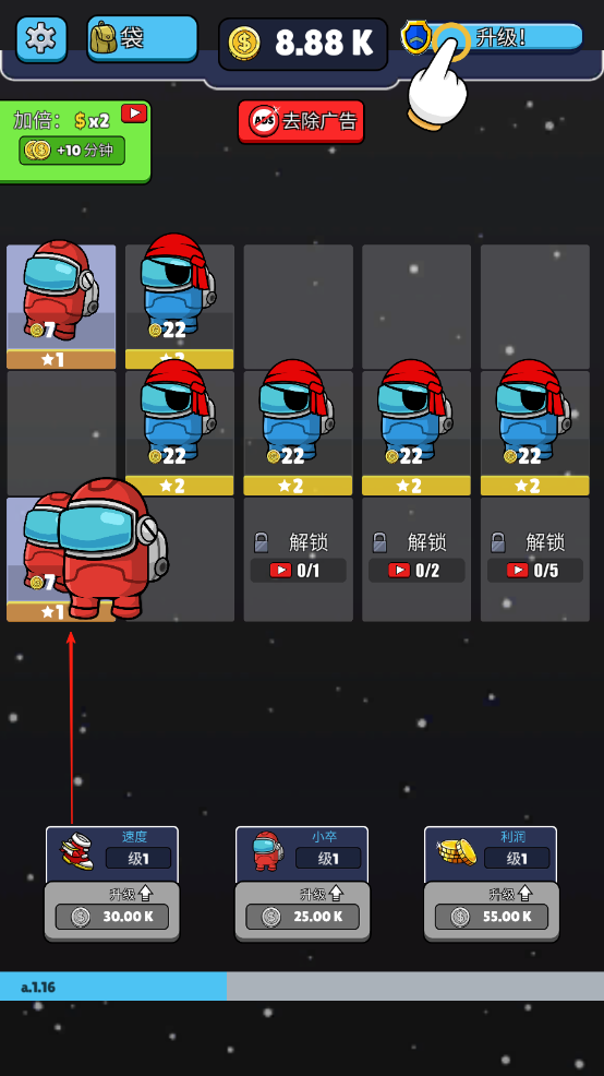 2、下方可以利用小人在合并栏里不断生成的钱给小人或速度,利润等升级,右上角进度条满的时候就可以升级。