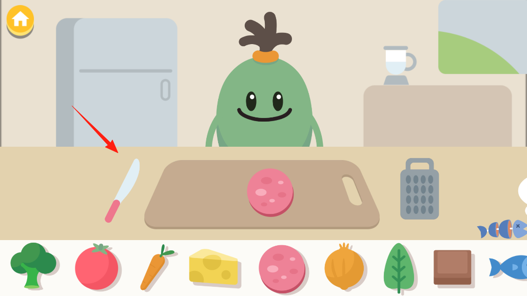 1、博福要做菜啦,先看下方食材栏,选喜欢的食材拖到菜板上,像这把刀,点它就能开始处理食材,切一切剁一剁,为做菜做准备。