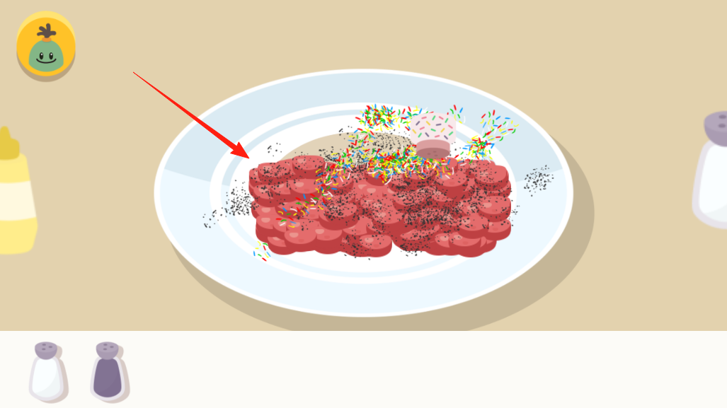 3、肉煎好装盘,该调味啦,下方有盐调料瓶这些,点击撒在肉上,还能加点彩色糖屑搞点创意,根据自己喜好装饰菜品,做出独一无二的美食。