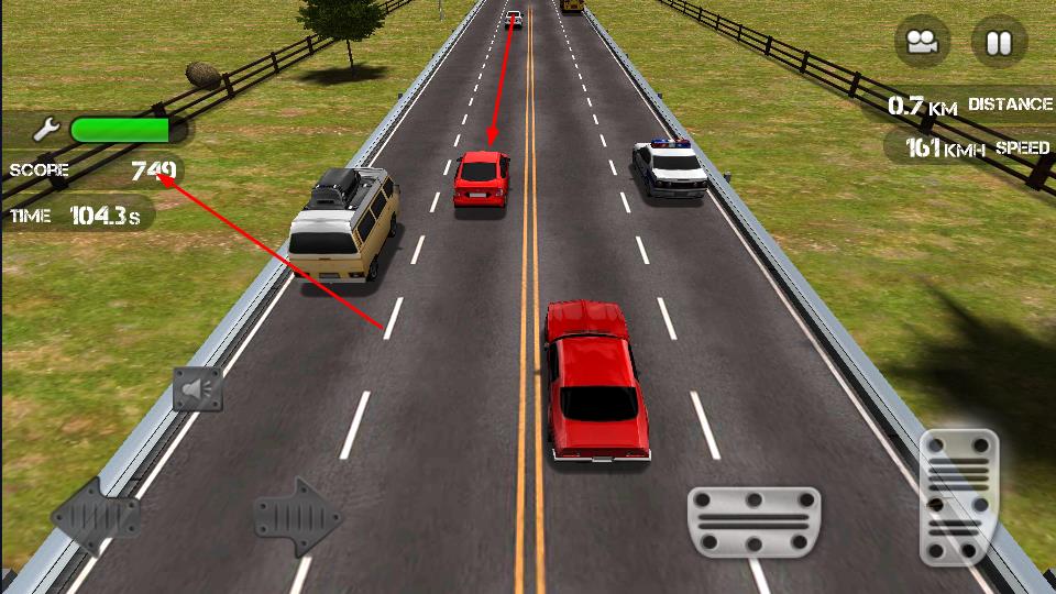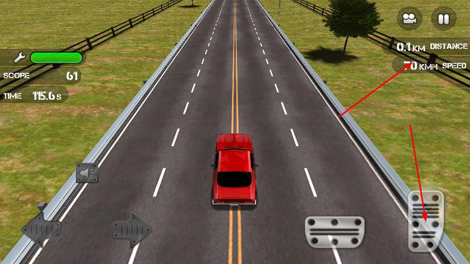 2、然后就进入赛道后,点击右侧按键控制油门加速,通过方向按键调整行车路线,留意上方速度、距离数据。