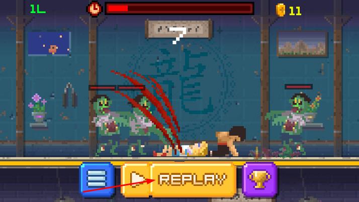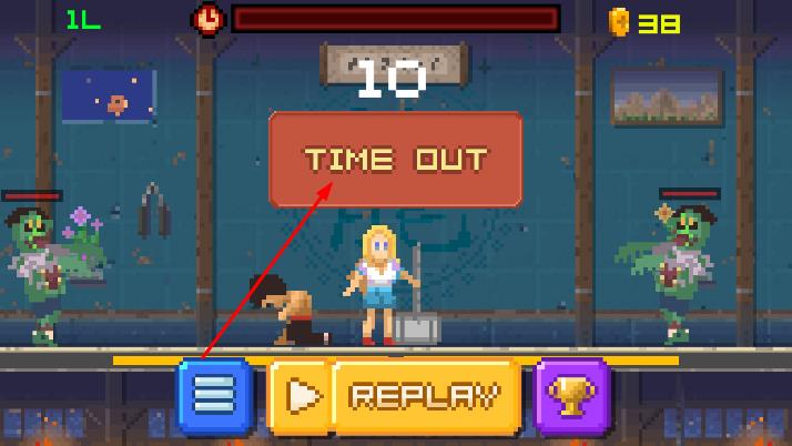 3、如果不幸失败,出现REPLAY按钮,点击该按钮可以重新开始当前关卡,再次挑战击退僵尸拯救公主,不断提升操作技巧。
