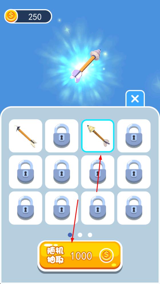1、花费1000金币点击随机抽取按钮,解锁箭矢武器,提升射击战斗能力,为后续关卡挑战做好准备。