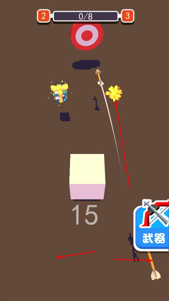 2、瞄准上方目标射箭,同时留意收集礼物道具,推进关卡进度,朝着完成目标努力,合理规划每一次射击操作。