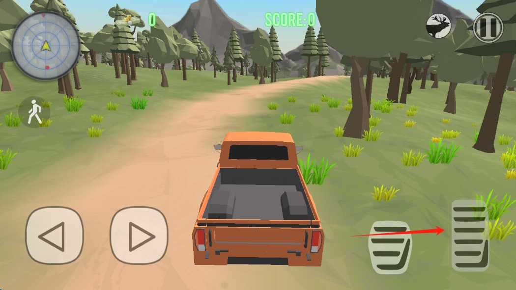 2、操控橙色车辆在野外行驶,利用地图和指南针,探索森林区域,搜寻猎物踪迹,点击加速。