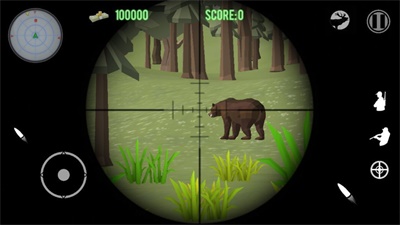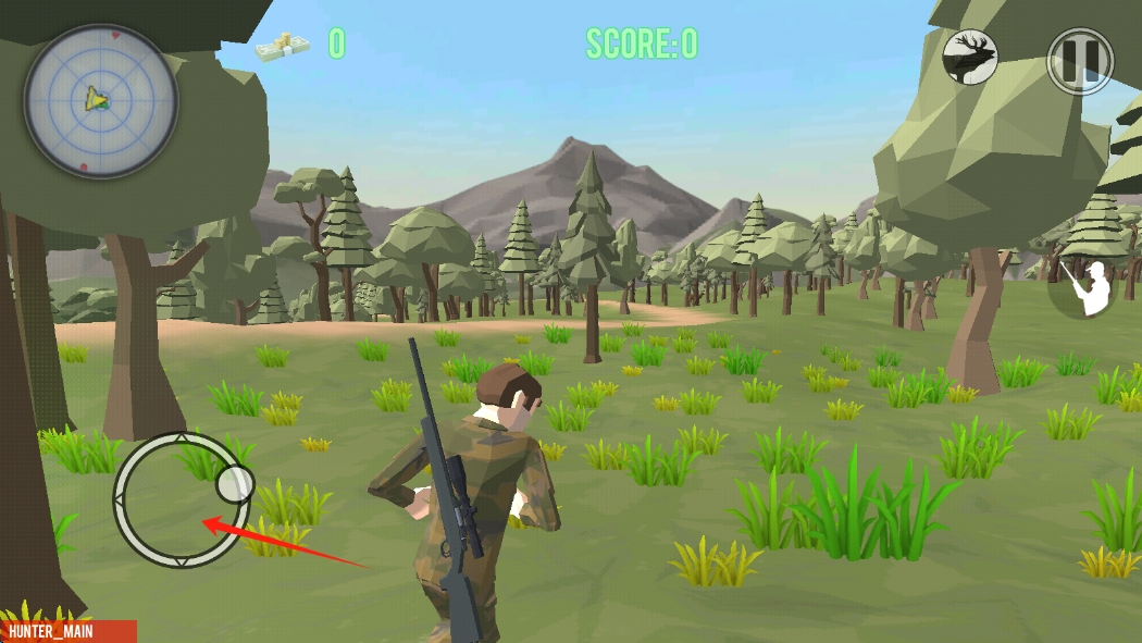 3、下车后,操控猎人在森林中移动,靠近猎物,瞄准射击,完成狩猎目标,拨动轮盘移动人物。