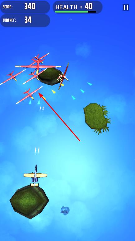 2、在场景中,操控战斗机在空中飞行,通过虚拟操作按钮,控制战斗机的方向和射击,攻击其他红色的敌机。