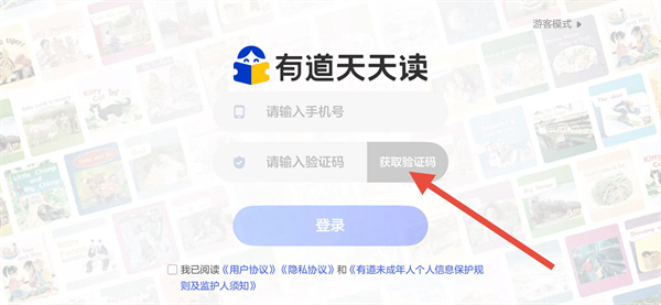 1、在有道天天读app界面,点击右上角请登录,弹出登录选项菜单。