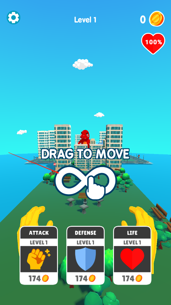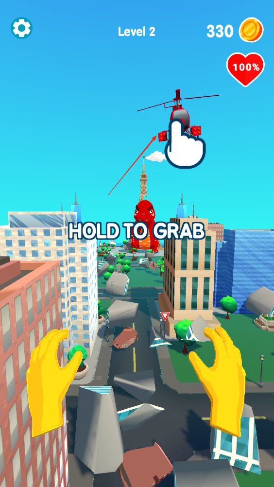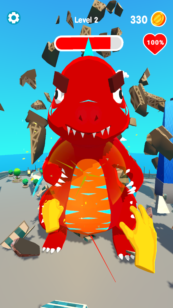 1、操控自己的巨人双手,通过点击、滑动屏幕的操作,对周围的建筑、设施发起破坏,向上滑动即可摧毁眼前的楼房。