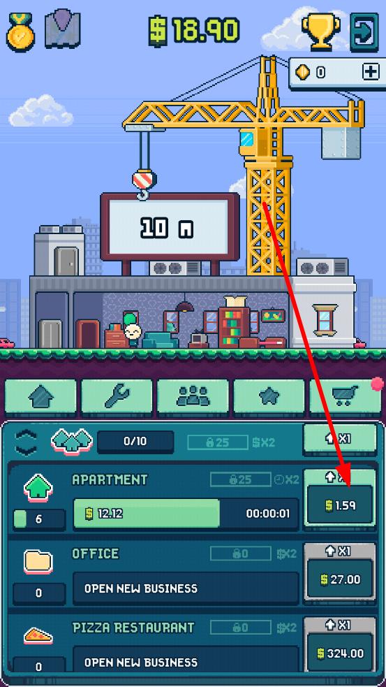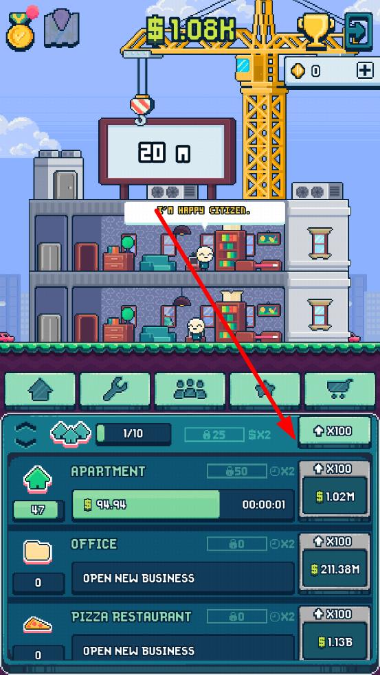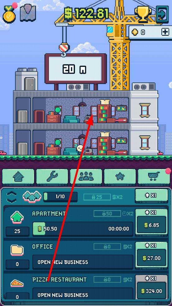 2、积累足量金币后,解锁办公室、披萨餐厅等新建筑,居民楼升级到20级后,将再盖上一层楼,加速楼层搭建与城区扩张。
