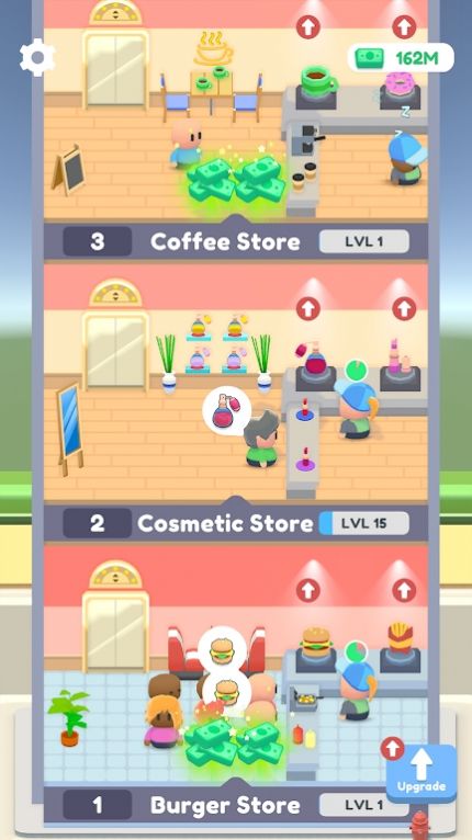 3、居民入住后建筑自动产出金币,离线时收益持续累加,定期上线收取金币,解锁高阶建筑,可点击按钮,方便玩家直接升级,逐步构建多元化商业城区。
