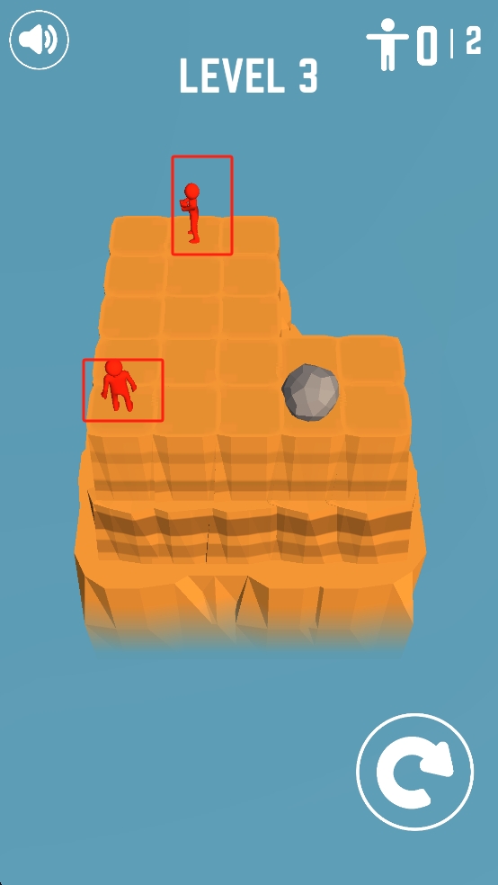 3、这关需要观察两个红色小人与石块的位置,滑动石块规划移动轨迹,依次将两个红色小人都推落平台。