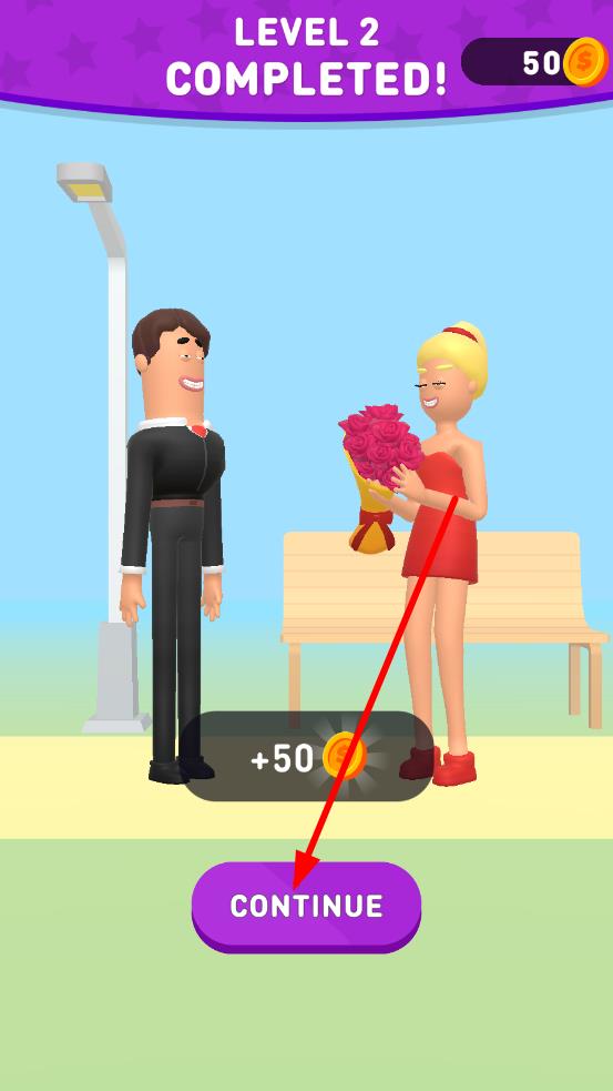 3、当角色达成任务目标,界面弹出COMPLETED提示,获得金币奖励,点击CONTINUE解锁后续更复杂的脑洞关卡。