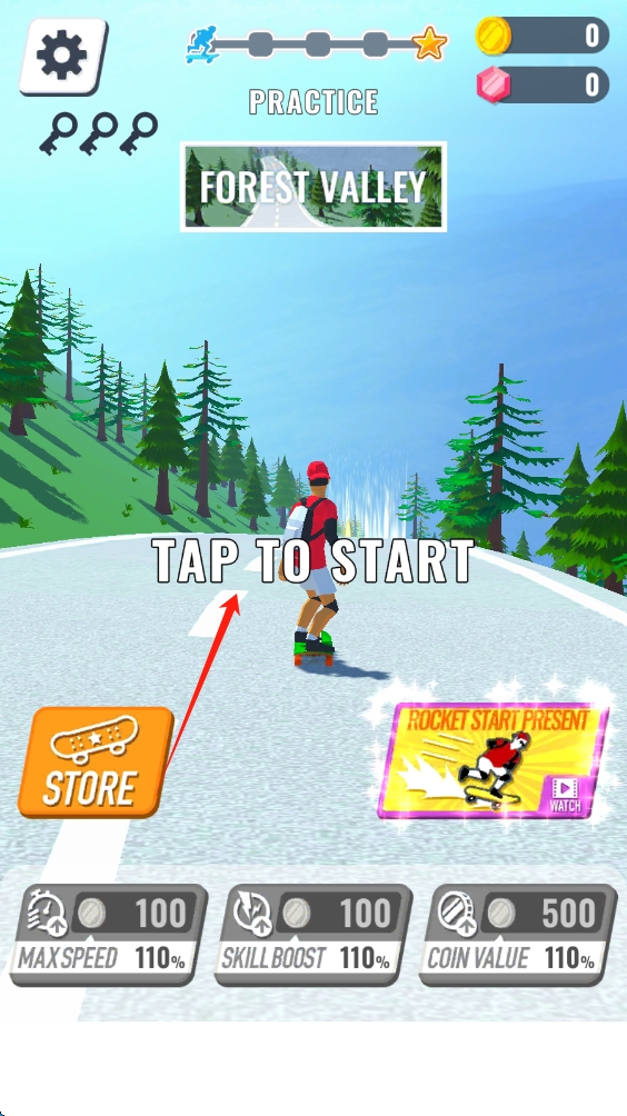 1、点击TAP-TO-START,开启滑板跑酷,在森林山谷道路上展开刺激滑行,点击开始游戏。