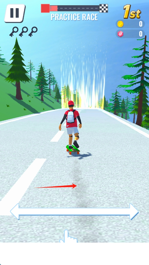 2、操控滑板角色左右移动,躲避障碍,收集金币和道具,提升跑酷表现,滑动移动人物。