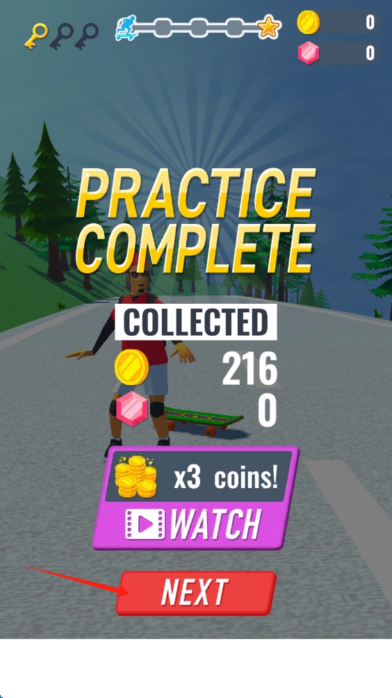 3、完成练习,看到PRACTICE-COMPLETE提示,点击NEXT,进入下一关挑战获得新的成就。