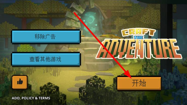 1、进入游戏界面,点击橙色的开始按钮,开启像素风冒险之旅,可探索后续场景、完成任务。