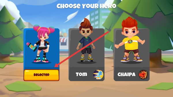 1、在英雄选择界面,选定标有SELECTED的粉色滑板角色,进入游戏街道场景开启冒险。