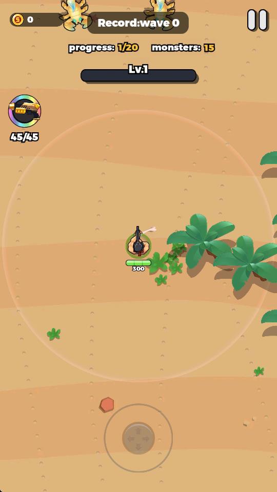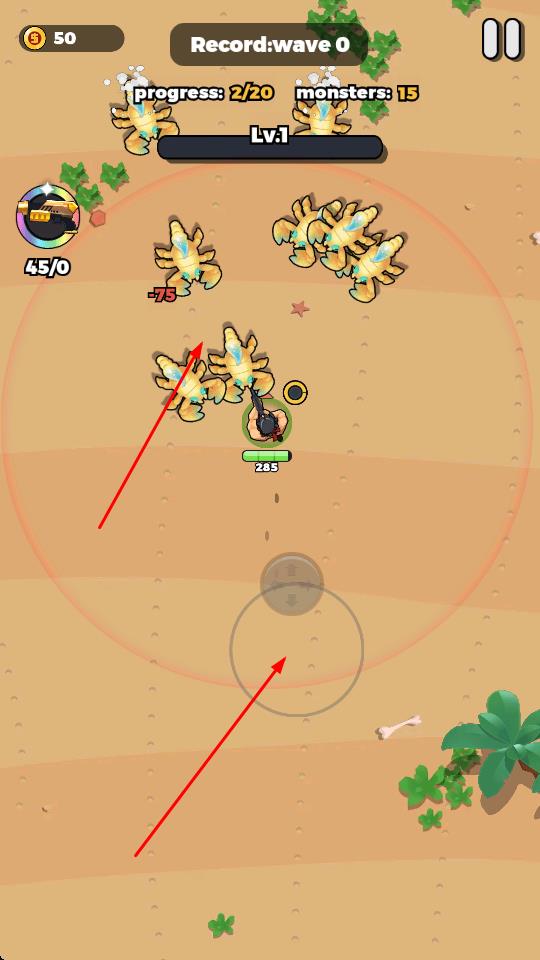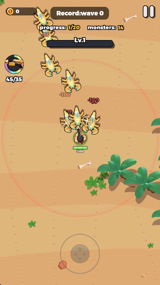 1、操控底部虚拟摇杆移动角色,自动攻击周围怪物如沙漠龙虾、野兽,界面上方显示金币、进度波数、怪物数量及角色等级,需消灭指定数量怪物以推进关卡。