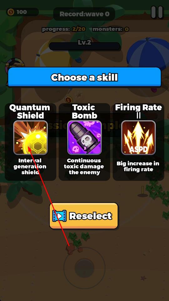 2、角色升级如Lv.2时,弹出技能选择界面,可选Quantum Shield间隔生成护盾、Toxic Bomb对敌人造成持续毒害、Firing Rate,按需选择技能强化战斗能力。