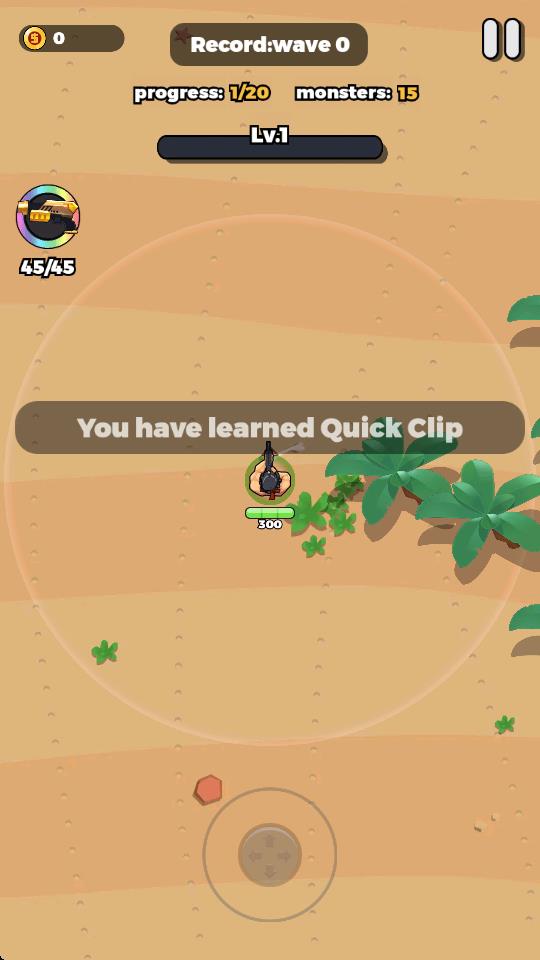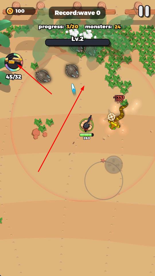 3、点击左侧武器图标切换武器,战斗中结合技能与武器特性,规避怪物攻击,持续推进波数progress、刷新波数记录,积累金币用于解锁更强装备、技能,提升生存能力。