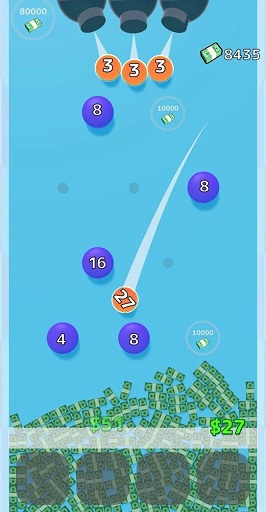 1、连锁碰撞爽感:弹珠碰撞数字球触发连续弹跳,多弹珠在场时轨迹交织,形成连锁碰撞狂潮,分数随碰撞次数疯狂跳动,暴击特效闪烁间,享受分数爆发爽快感。