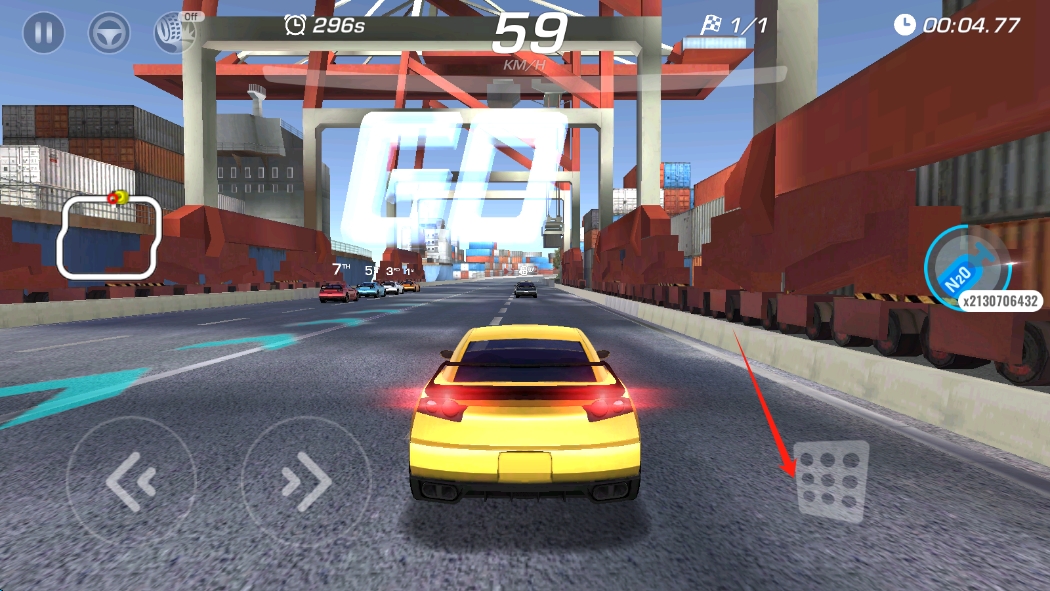 1、在游戏起步界面,做好准备,点击右侧按钮,让黄色赛车在港口赛道顺利起步,开启竞速之旅。