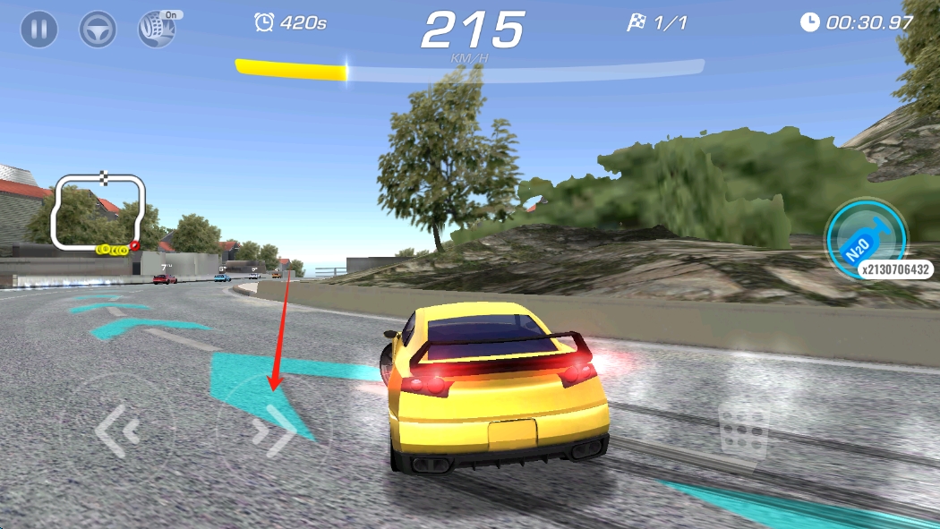 2、在赛道行驶中,点击左侧方向按钮,灵活控制赛车方向,躲避障碍,超越对手,不断提升速度。