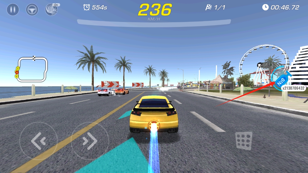 3、关键时刻,点击右侧N2O按钮,使用氮气加速,获得强劲动力,快速拉开与对手的距离,冲向终点。